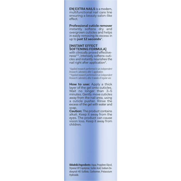 Applicare uno spesso strato di gel sulle cuticole. Attendere non più di 3-5 minuti. Utilizzando un bastoncino, rimuovere delicatamente le cuticole dalla zona dell'unghia. Rimuovere il prodotto in eccesso con acqua calda e sapone. Le unghie sono pronte per le fasi successive della manicure. L'uso regolare del gel previene la formazione di pellicine sulla lamina ungueale e la loro screpolatura.